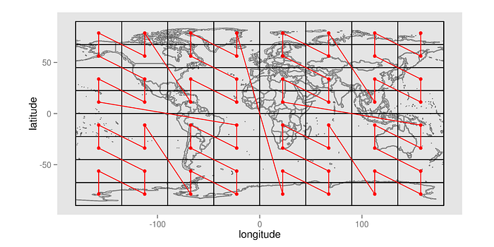 Data is stored with a key that represents the time/space location of the record, specifically the longitude, latitude, and time with a three-dimensional space filling curve is used. This red line is known as a space-filling curve, or to be more specific, a Z-Curve. This line visits each cell exactly once, establishing a unique ordering of cells. Space-filling curves can be adapted for n dimensions, letting GeoMesa linearize n dimensions of data in a single dimension.